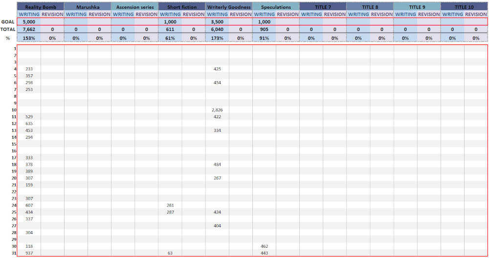 Overall, I wrote 15,218 words, or 145% of my 10,500-work goal.
