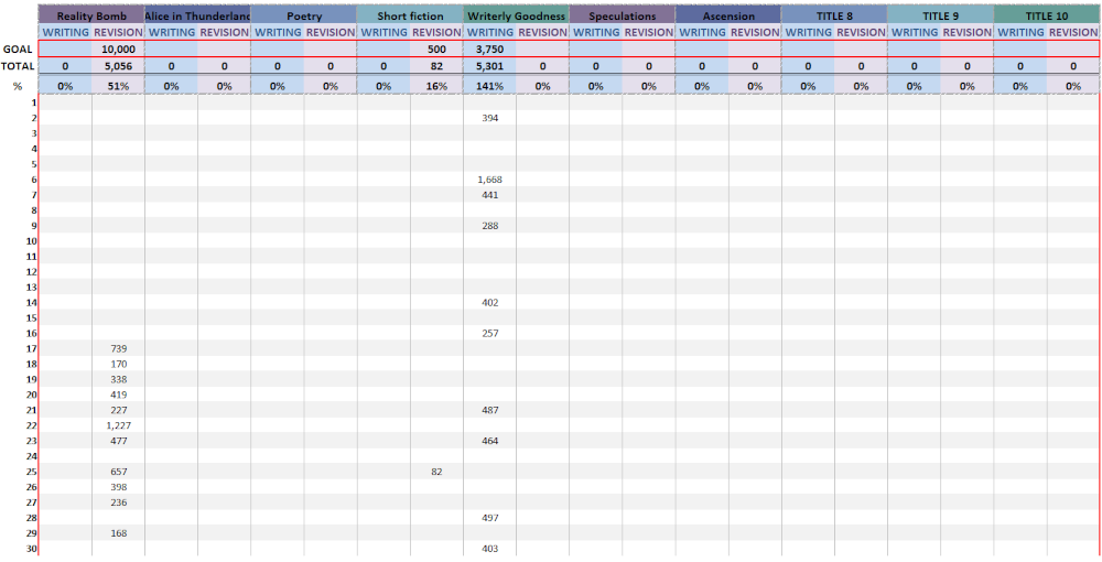 It’s probably not surprising, then, that of the 10,000 words I’d hoped to revise/rewrite on Reality Bomb, I only managed 5,056 words, or 51% of goal.