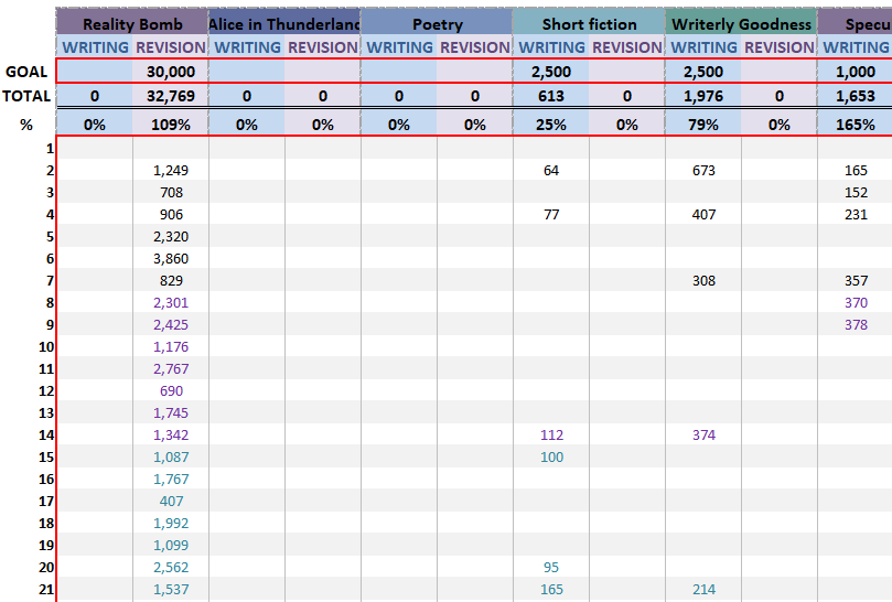 I expected my production to dip with my return to work, and there was one day where I only managed 407 words of revision, and two others where I logged less than 1,667 words (1,187 and 1,099, to be specific). Otherwise, though, I recorded over the 1,667 and made up for the shortfall.