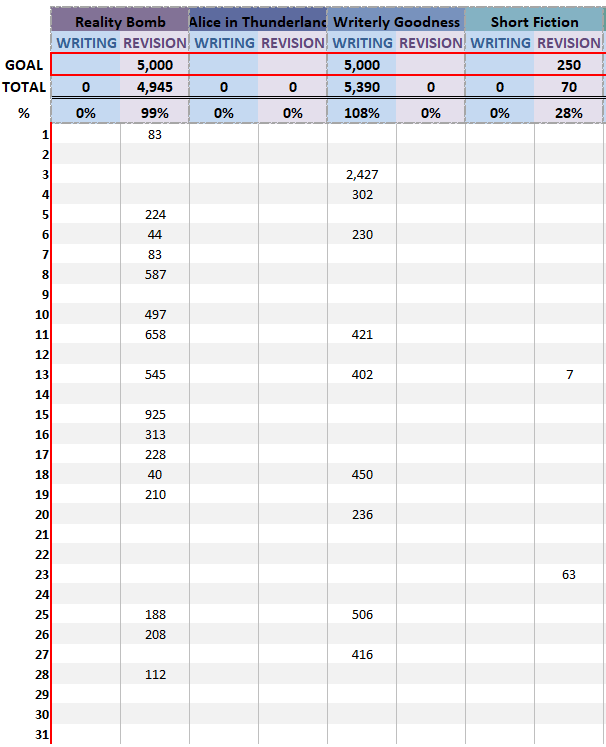 Originally, I thought I might be able to get as much as 10,000 words revised on RB (though I suspected that it was a bit optimistic). Part-way through the month, I adjusted that down to 5,000 words. I still fell a bit short of that, revising 4,945 words, or 99% or my adjusted goal.