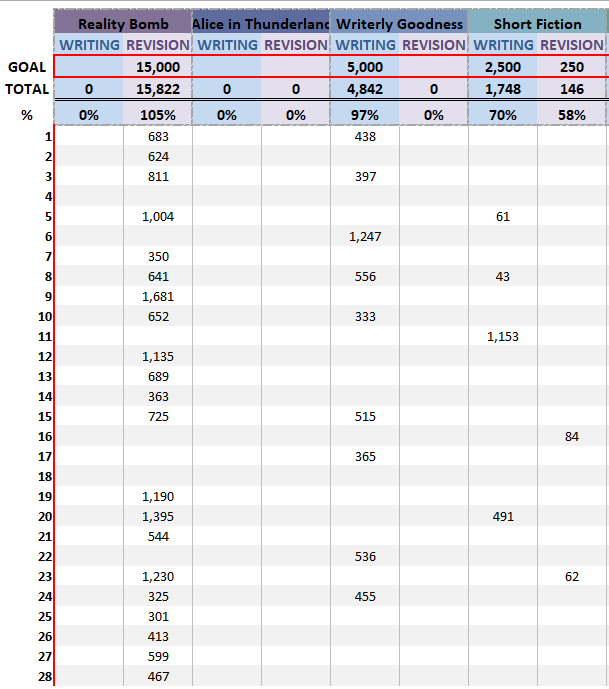 I revised 15,822 words of Reality Bomb, or 105% of my goal. Yay!