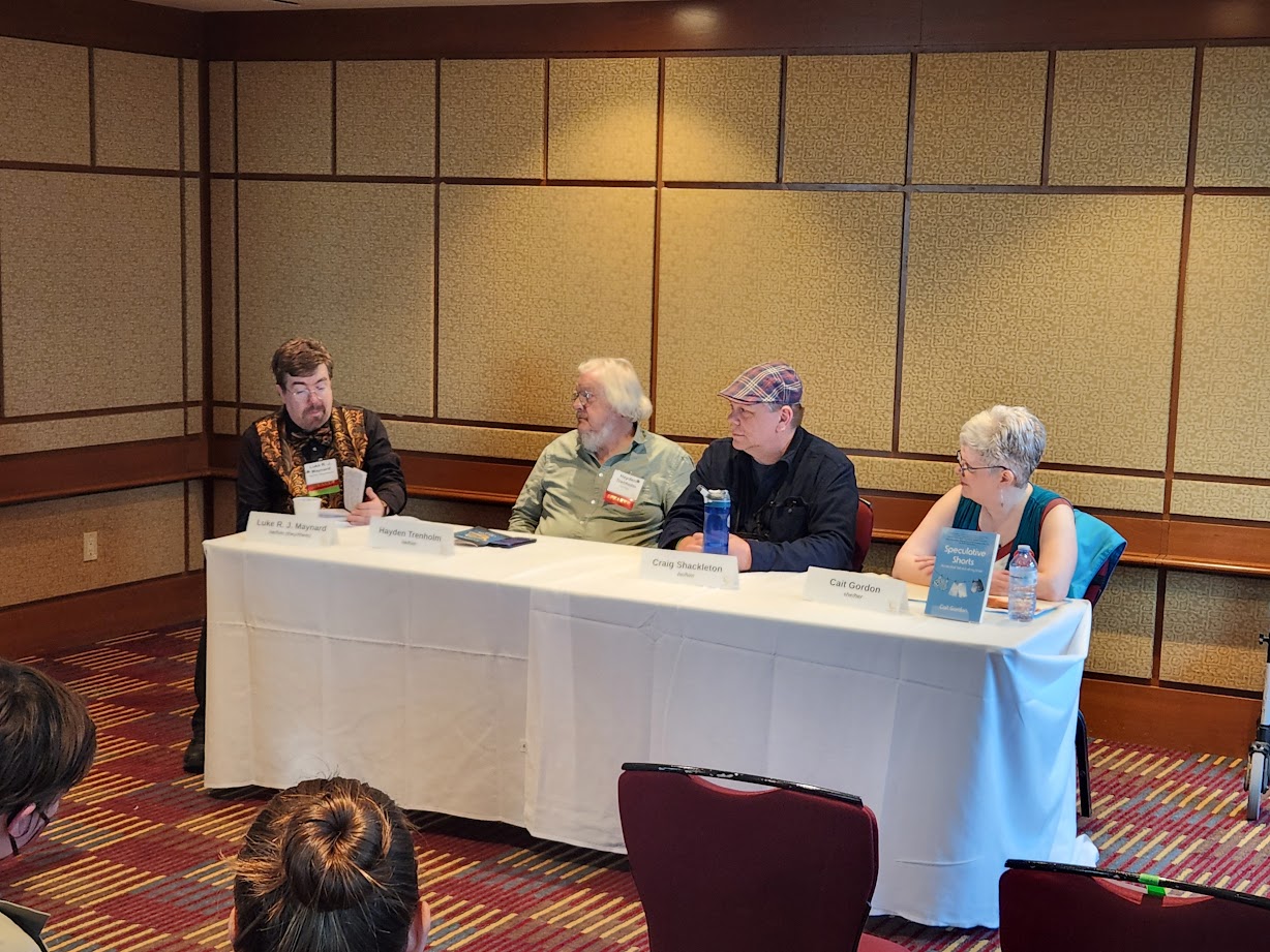 On Sunday, I treated myself to another morning swim before breakfast. I attended even more panels, and the launch of Cait Gordon’s Speculative Shorts: Stories That Fell Out of My Brain.