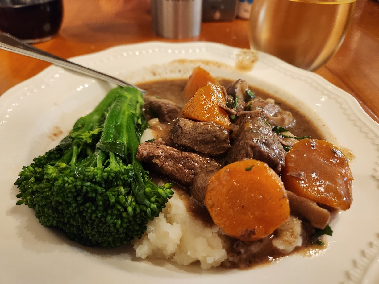 I spent part of the afternoon on the patio and the rest inside. It was my most productive day. I checked the water temperature — too cold for a dip — before a trip to the sauna. Then, it was time for supper, which was a delicious beef bourguignon, mashed potatoes, and broccolini.