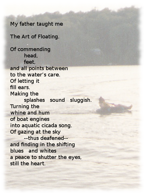 Dad had a nigh on miraculous ability to float. He could lie on his back in the water, put his hands behind his head, and just float, head, belly, and toes all poking above the surface. He was unsinkable. My cousin swears that he caught Dad sleeping that way. I like to think of my Dad floating away in the afterlife, still unsinkable.