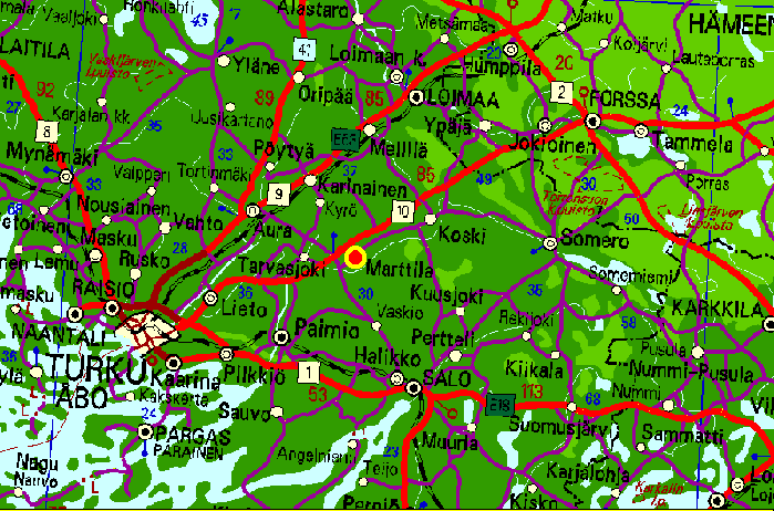 I turned off the main highway onto smaller and smaller roads and, eventually, I found Marttila. The land around the town was all farmland. It reminded me more of some of the towns on Manitoulin Island. I saw what might have been a school, or a library, a grocery store, where I stopped to pick up some snacks for the road and ask if there was a place to eat and maybe a restroom I could use … ?