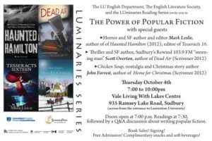 A lot is happening up here in the north. Matthew Del Papa published Green Eyes through Capreol, a collection of short stories based on life in the railway town. Scott Overton had one of his short stories accepted into the recently published Tesseracts 16, will have his first book, Dead Air, launched October 11, 2012, and next week, he will take part in the LUminaries reading series at Laurentian University along with Mark Leslie and John Forrest presenting on the topic âThe Power of Popular Fiction.â
