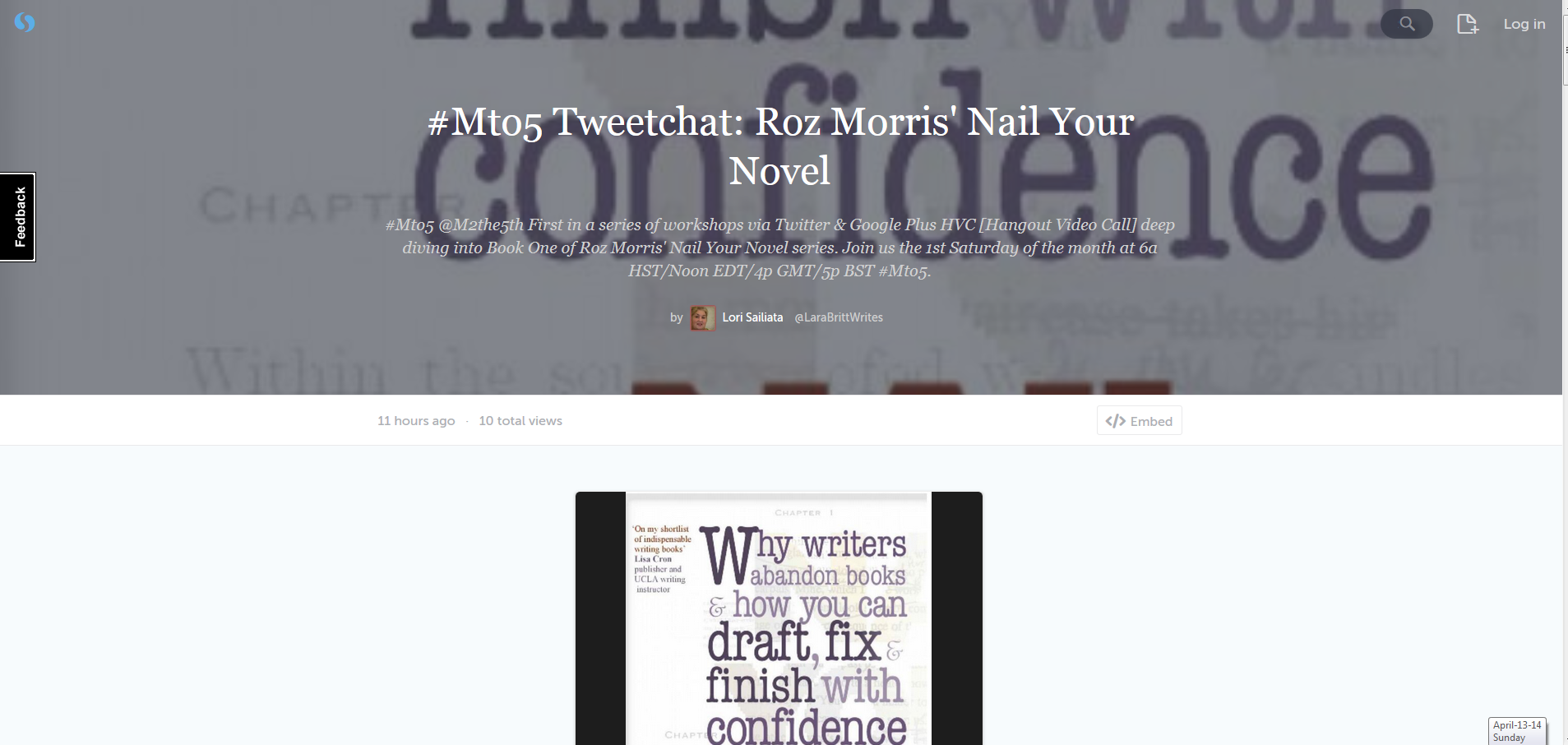 Here is the Storify of the Twitter portion: https://storify.com/LaraBrittWrites/mto5-tweetchat-roz-morris-hel?awesm=sfy.co_jg2A